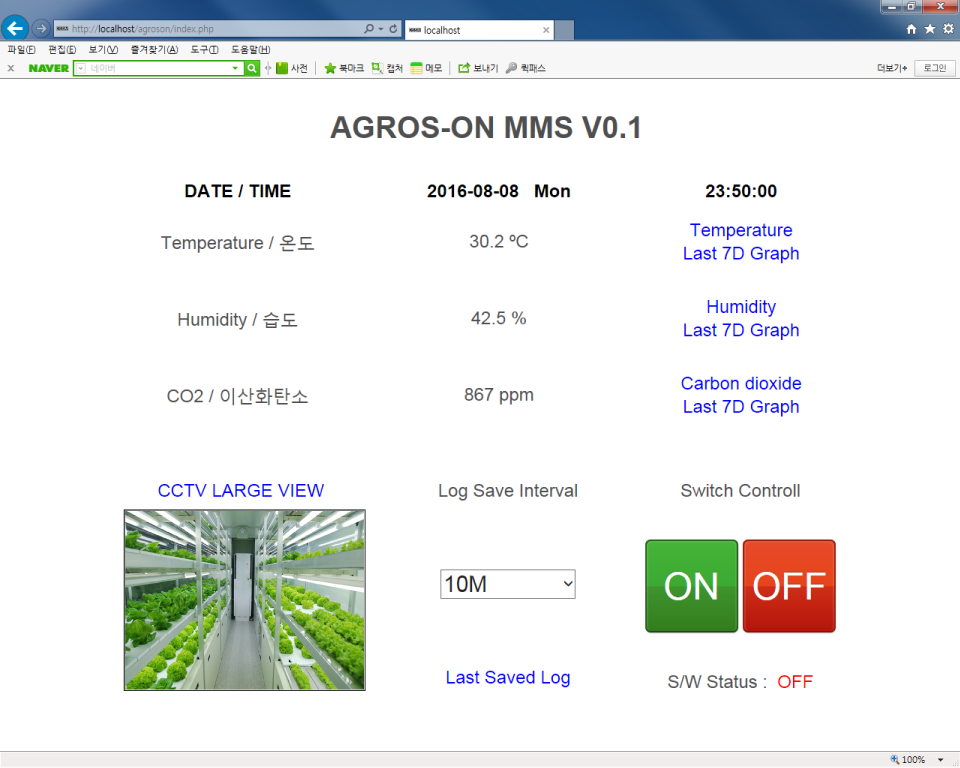 페이지 정보 작성자 유진아이티에스 작성일16-11-11 17:24 조회11,328회 이전글 다음글 목록 본문 - 온실 환경 측정 및 제어- Web Service- 온도, 습도, CO2 측정- CCTV (Web Stream)- GPIO를 통한 Relay 컨트롤- Log 관리 이전글 다음글 목록